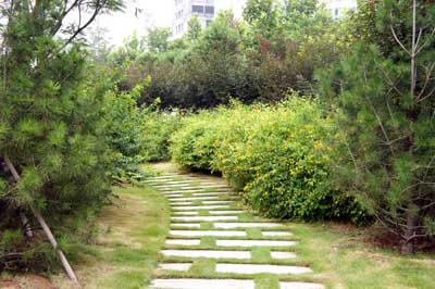 每個景觀節(jié)點上,植物的配置方法都是不一樣的,如在下沉廣場,主要是以小龍柏、金葉女貞等小灌木片植成方形或弧形,間或點綴石楠、梅樹,看起來規(guī)整、簡潔;而在設計風格為江南園林的南廣場上,是將貴重的造型油松單植,通過不同的組合,形成三個風格相近的綠島,周邊種植美人蕉、玉簪、竹子,并砌起白墻,上面開圓形拱門或圓窗,散發(fā)出詩意江南的靜謐和婉約氣息?!坝雾降朗秦灤┱麄€景觀的軸線,為了形成曲徑通幽的景觀效果,我們將對植、孤植、叢植都多種方法結(jié)合運用,特別是在三叉路口,多種植海棠、櫻花、杏花等,一方面,花開的時候,綠葉間繁花點點,會吸引人們不斷向前探尋更多的美景;而花落之后,茂密的枝葉又形成隱隱約約的視覺感受,前方轉(zhuǎn)過彎后風景什么樣,又讓人很想去看看?!备呓?jīng)理笑著說。