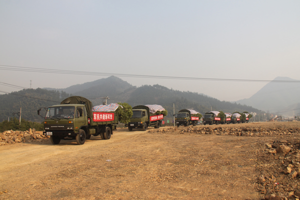 下午3點(diǎn)50分,八輛一字排開的軍車全部裝上了苗木,并進(jìn)行了仔細(xì)的遮蓋和捆綁。隨后,在噼噼叭叭的鞭炮歡送聲中,車輛徐徐開出基地,向舟山方向駛?cè)ァ?/p>