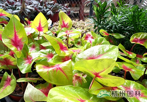 花葉芋:紅與黃交織的葉面色彩絢麗奪目,充滿了生機(jī)和活力,讓人的心情瞬間明亮起來(lái)。