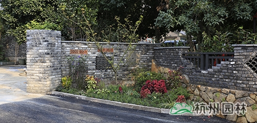 錢三組共有31戶人家,以前,這里家家都是高墻大院,雖然每家的小樓都蓋得很有特色,但卻被高高的院墻擋住了院內(nèi)的風光,而且整體綠化景觀單一,缺乏本土特色和文化氣息。如今,高高的圍墻被拆除,改為以舊青磚為主,搭配鋁合金欄桿,以老石板、舊瓦片、老石磨、老石鼓等作為點綴,懷舊物件與現(xiàn)代元素有機結(jié)合,營造出全新的集古樸與時尚于一體的敞開式景墻。在景墻內(nèi)側(cè)種植桂花、意大利絡(luò)石等綠籬,墻外地面種植麥冬等常綠草本植物;在每家庭院入口兩側(cè)和一些節(jié)點處設(shè)置小花境,種植各類常綠、色葉、草花等植物,營造出風格多樣的花境景觀,在軟化景墻生硬感的同時,景觀更加豐富多變。