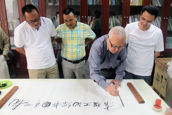 孫老不僅是一位園林規(guī)劃設(shè)計(jì)專家,同時(shí)也是一位書畫名家,他曾師從徐悲鴻、孫多慈教授學(xué)畫,具有很高的藝術(shù)修養(yǎng)。在我們的邀請下,孫老欣然提筆,寫下了“杭州市園林綠化工程有限公司”、“易大景觀”等公司名稱,以及“天然圖畫”、“造化為師”等題詞,以精準(zhǔn)的語言凝煉了他對園林行業(yè)的看法,寥寥數(shù)語中,讓我們深受啟發(fā)。行云流水的筆法、流暢飽滿的線條,每一幅題字都一氣呵成,每一幅題字都是一幅藝術(shù)畫。每幅題字寫完,大家都會(huì)報(bào)以熱烈的掌聲,孫老對園林的深刻見解及深厚的書法功底令我們深深折服。