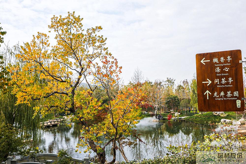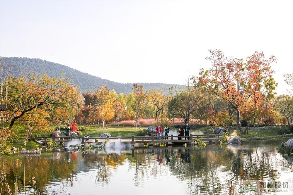 契合展區(qū)主題的樾香亭臨湖而立,雙坡屋面,八柱敞亭,柱子上書五言聯(lián)“魚樂人亦樂,泉清心共清”,盡顯悠閑舒適的情趣。在亭內(nèi)憑欄而坐,側(cè)耳聽風(fēng)雨,迎風(fēng)嗅花香。抬頭遠(yuǎn)望,荷葉亭亭的水面上,有魚兒在水中嬉戲;曲折的長橋上,游人在漫步觀景;水岸邊,銀杏、三角楓、烏桕等色彩繽紛,編織出一幅深秋的美麗畫卷。